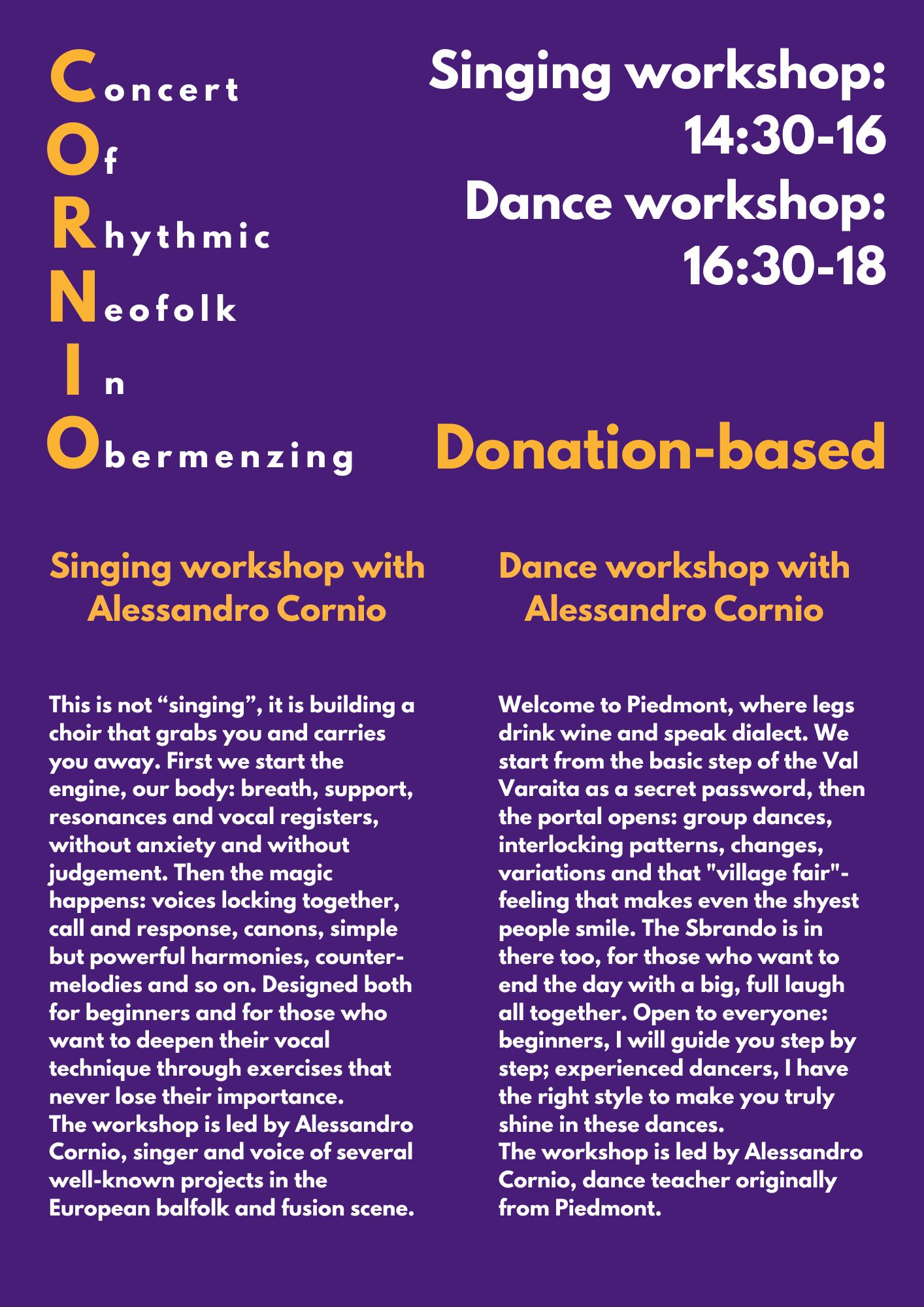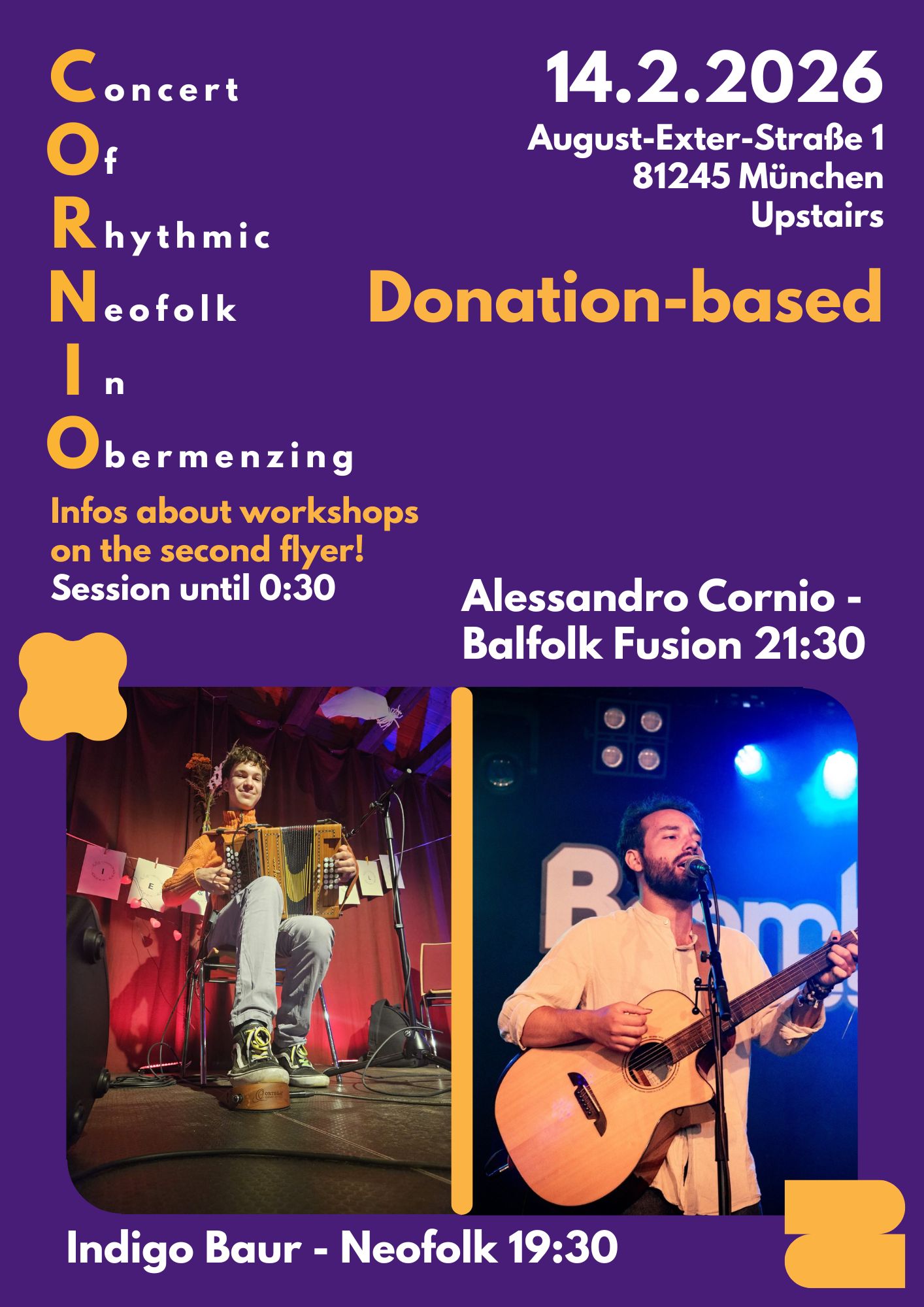Sa 14. Februar 19.30 Uhr Pasinger Fabrik: Balfolk mit Indigo Baur und Alessandro Cornio; Workshops: Singen 14:30 - 16 Uhr, Tanzen 16:30 - 18 Uhr; Details siehe Flyer1, Flyer2
